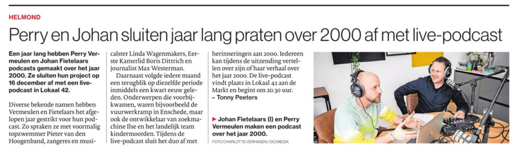 Heel het jaar spraken we over het magische jaar 2000. Een podcast met hoofdpersonen en onderwerpen van toen: Pieter van den Hoogenband, Linda Wagenmakers, Max Westerman, Jop uit De Bus, Boris Dittrich… maar ook de vuurwerkramp, Bush vs Gore, het EK in eigen land en veel, veel meer. We sluiten op 16 december af met een live podcast in Lokaal 42. Deuren open vanaf 20 uur, aanvang 20:30 uur. En het mooie is: jij mag meepraten! Hoe was jouw 2000? Welke ontwikkelingen staan jou bij? Heb je nog steeds pijn aan je duim van je Snake-verslaving op je Nokia? Wees welkom!!